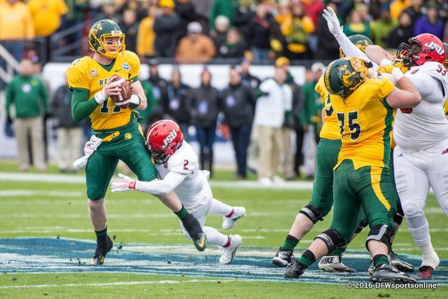 2016 FCS Football Championship DFW_7385-1 Image 6 of 28 North Dakota State quarterback Carson Wentz under pressure at the 2016 NCAA Dvision I Football Championship Game at Toyota Stadium in Frisco, TX, January 9, 2016. Photo by George Walker for DFWsportsonline Share and Enjoy !Shares Tweet