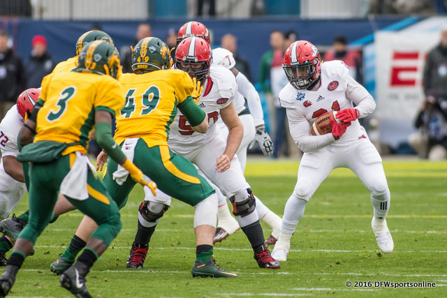 2016 FCS Football Championship DFW_7407-1 Image 14 of 28 Jacksonville State running back Miles Jones looks for running room at the 2016 NCAA Dvision I Football Championship Game at Toyota Stadium in Frisco, TX, January 9, 2016. Photo by George Walker for DFWsportsonline Share and Enjoy !Shares Tweet