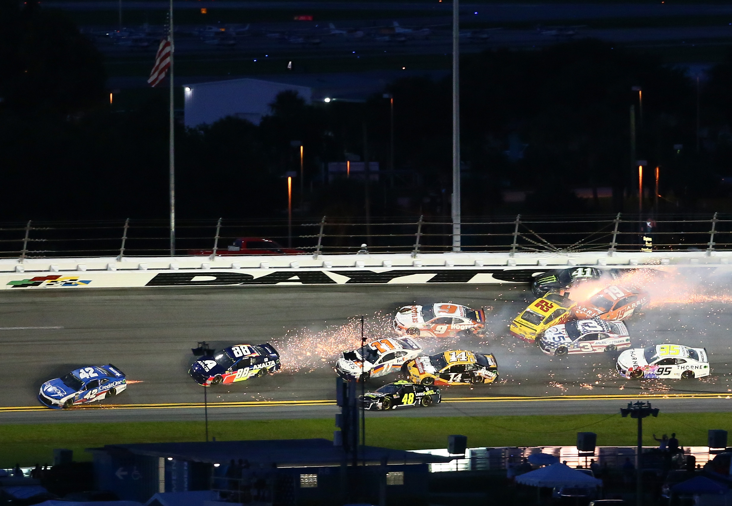 By Reid Spencer NASCAR Wire Service DAYTONA BEACH, Fla. – In a wild war of attrition that went to two…