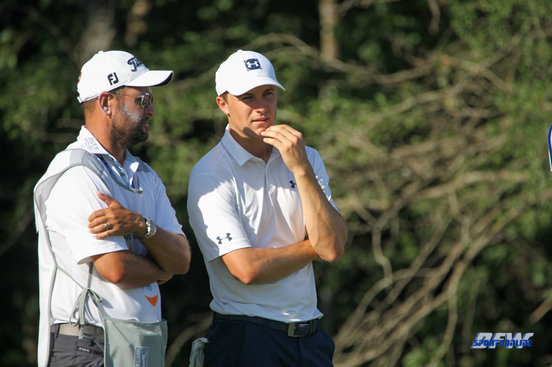 DALLAS, TX - MAY 17: Jordan Spieth (USA) talks with his caddie on the 17th green during the first round of the AT&T Byron Nelson on May 17, 2018 at Trinity Forest Golf Club in Dallas, TX. (Photo by George Walker/Icon Sportswire)
