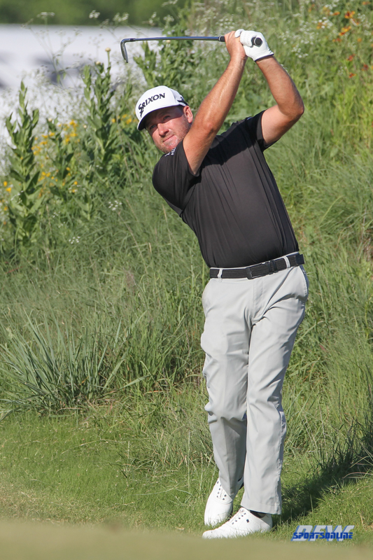 DALLAS, TX - MAY 17: Graeme McDowell (NIR) hits from the rough on the 18th hole during the first round of the AT&T Byron Nelson on May 17, 2018 at Trinity Forest Golf Club in Dallas, TX. (Photo by George Walker/Icon Sportswire)