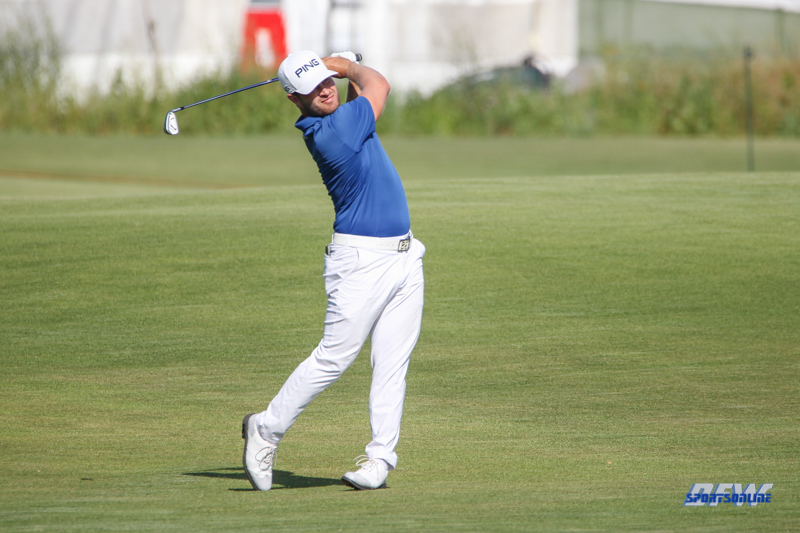 DALLAS, TX - MAY 18: David Lingmerth (SWE) hits an approach shot on the 18th hole during the second round of the AT&T Byron Nelson on May 18, 2018 at Trinity Forest Golf Club in Dallas, TX. (Photo by George Walker/Icon Sportswire)