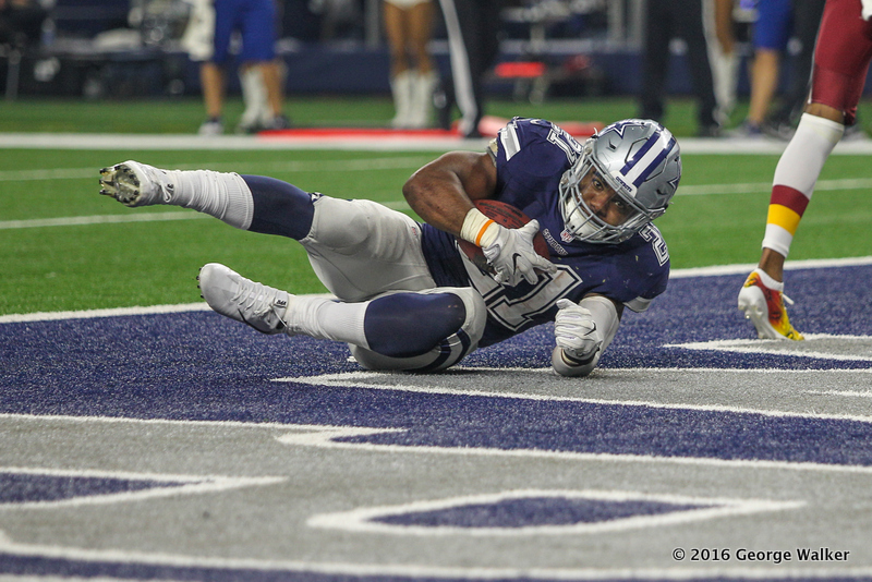 ARLINGTON, TX - NOVEMBER 24: Dallas Cowboys Running Back Ezekiel Elliott (21) dives into the end zone for a touchdown during the NFL game between the Washington Redskins and the Dallas Cowboys on November 24, 2016, at AT&T Stadium in Arlington, TX. (Photo by George Walker/Icon Sportswire)