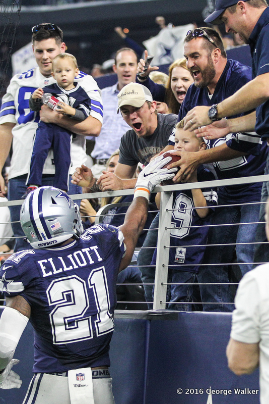 ARLINGTON, TX - NOVEMBER 24: Dallas Cowboys Running Back Ezekiel Elliott (21) gives the ball to a young fan after a touchdown during the NFL game between the Washington Redskins and the Dallas Cowboys on November 24, 2016, at AT&T Stadium in Arlington, TX. (Photo by George Walker/Icon Sportswire)