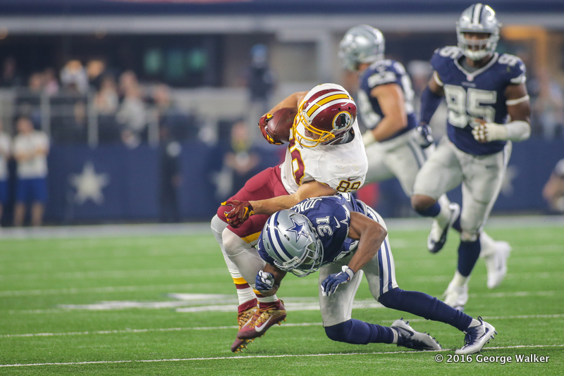 ARLINGTON, TX - NOVEMBER 24: Washington Redskins Tight End Derek Carrier (89) is tackled by Dallas Cowboys Safety Byron Jones (31) during the NFL game between the Washington Redskins and the Dallas Cowboys on November 24, 2016, at AT&T Stadium in Arlington, TX. (Photo by George Walker/Icon Sportswire)