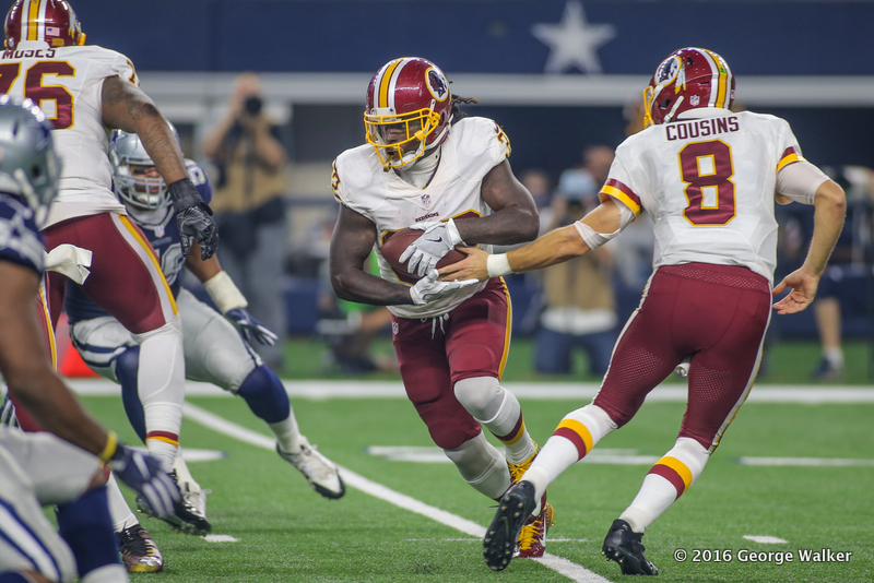 ARLINGTON, TX - NOVEMBER 24: Washington Redskins Running Back Robert Kelley (32) takes a handoff from Washington Redskins Quarterback Kirk Cousins (8) during the NFL game between the Washington Redskins and the Dallas Cowboys on November 24, 2016, at AT&T Stadium in Arlington, TX. (Photo by George Walker/Icon Sportswire)