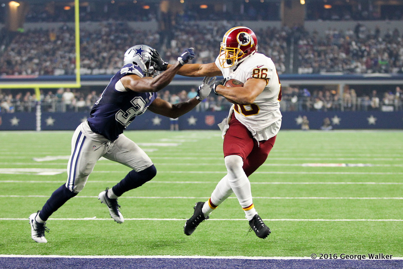 ARLINGTON, TX - NOVEMBER 24: Washington Redskins Tight End Jordan Reed (86) gives a stiff arm as he goes in the end zone for a touchdown during the NFL game between the Washington Redskins and the Dallas Cowboys on November 24, 2016, at AT&T Stadium in Arlington, TX. (Photo by George Walker/Icon Sportswire)