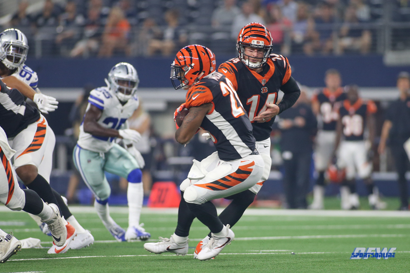 ARLINGTON, TX - AUGUST 18: Cincinnati Bengals quarterback Andy Dalton (14) hands off to Cincinnati Bengals running back Joe Mixon (28) during the preseason game between the Dallas Cowboys and Cincinnati Bengals on August 18, 2018 at AT&T Stadium in Arlington, TX. (Photo by George Walker/Icon Sportswire)