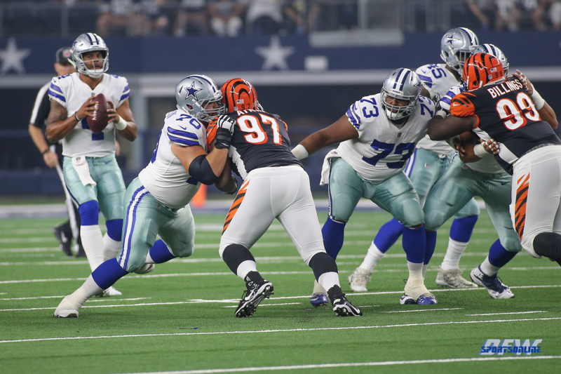 ARLINGTON, TX - AUGUST 18: Dallas Cowboys offensive guard Zack Martin (70) blocks Cincinnati Bengals defensive tackle Geno Atkins (97) during the preseason game between the Dallas Cowboys and Cincinnati Bengals on August 18, 2018 at AT&T Stadium in Arlington, TX. (Photo by George Walker/Icon Sportswire)