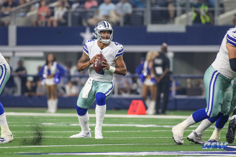 ARLINGTON, TX - AUGUST 18: Dallas Cowboys quarterback Dak Prescott (4) looks downfield to pass during the preseason game between the Dallas Cowboys and Cincinnati Bengals on August 18, 2018 at AT&T Stadium in Arlington, TX. (Photo by George Walker/Icon Sportswire)