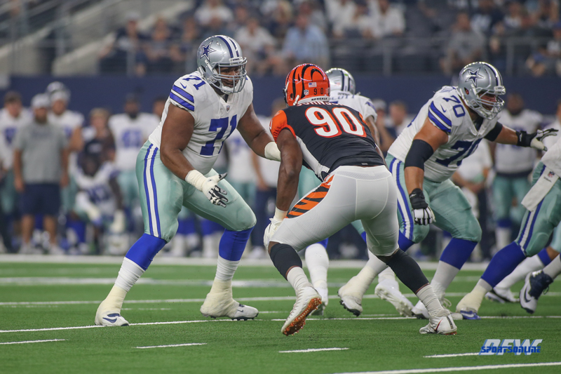 ARLINGTON, TX - AUGUST 18: Dallas Cowboys offensive tackle La'el Collins (71) blocks Cincinnati Bengals defensive end Michael Johnson (90) during the preseason game between the Dallas Cowboys and Cincinnati Bengals on August 18, 2018 at AT&T Stadium in Arlington, TX. (Photo by George Walker/Icon Sportswire)