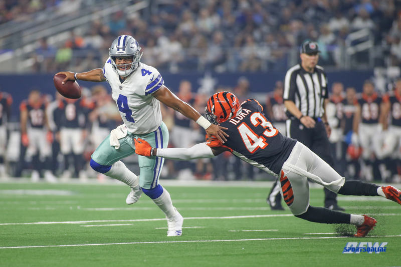 ARLINGTON, TX - AUGUST 18: Dallas Cowboys quarterback Dak Prescott (4) avoids a tackle by Cincinnati Bengals defensive back George Iloka (43) during the preseason game between the Dallas Cowboys and Cincinnati Bengals on August 18, 2018 at AT&T Stadium in Arlington, TX. (Photo by George Walker/Icon Sportswire)