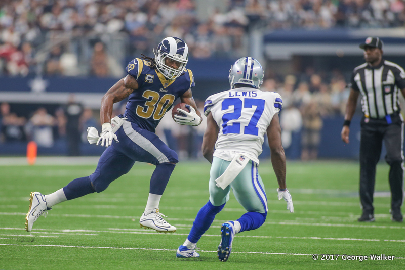 ARLINGTON, TX - OCTOBER 01: Los Angeles Rams running back Todd Gurley (30) tries to avoid Dallas Cowboys cornerback Jourdan Lewis (27) during the game between the Dallas Cowboys and the Los Angeles Rams on October 1, 2017 at AT&T Stadium in Arlington, TX. (Photo by George Walker/Icon Sportswire)