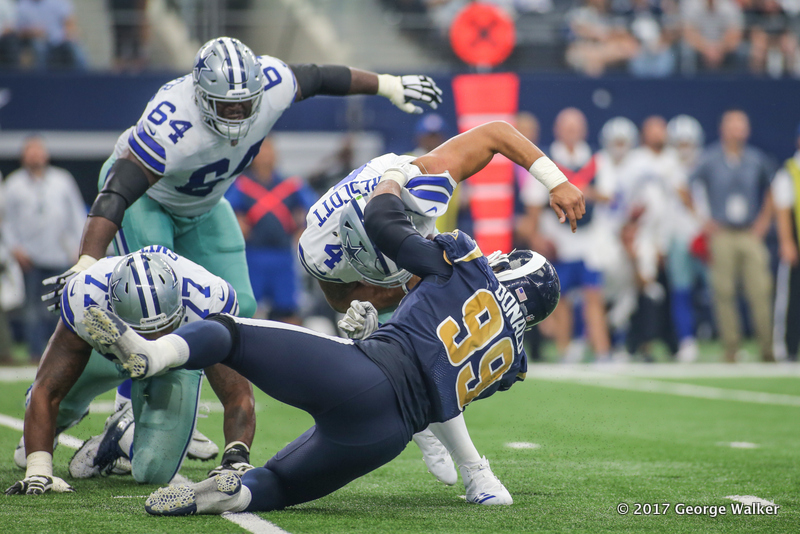 ARLINGTON, TX - OCTOBER 01: Dallas Cowboys quarterback Dak Prescott (4) is sacked by Los Angeles Rams defensive end Aaron Donald (99) during the game between the Dallas Cowboys and the Los Angeles Rams on October 1, 2017 at AT&T Stadium in Arlington, TX. (Photo by George Walker/Icon Sportswire)