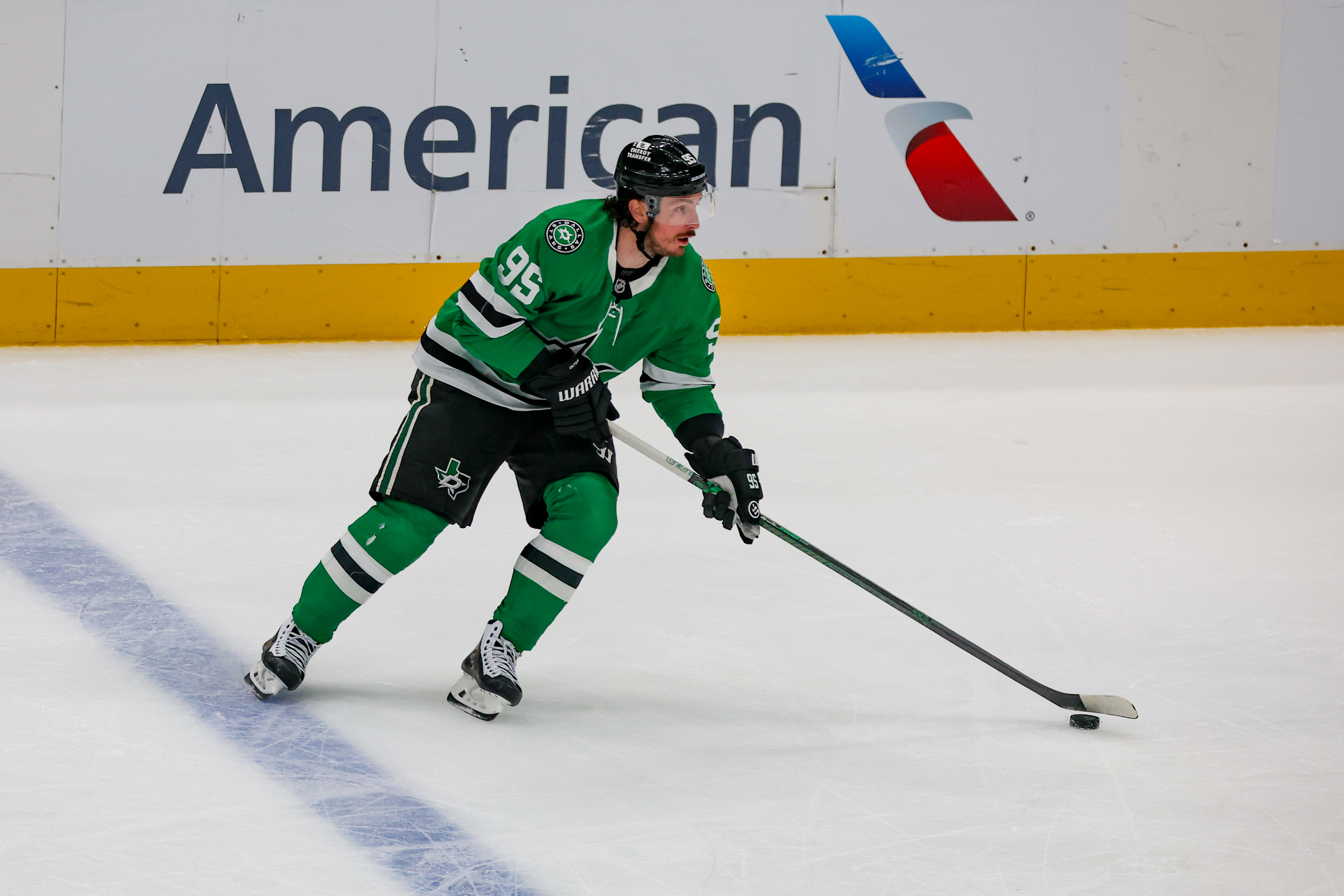 DALLAS, TX - APR 28: Dallas Stars center Matt Duchene (95) moves the puck during the Round 1 Game 5 of the 2025 Stanley Cup Playoffs game between the Dallas Stars and the Colorado Avalanche on April 28, 2025 at the American Airlines Center in Dallas, TX. (Photo by George Walker/DFWsportsonline)