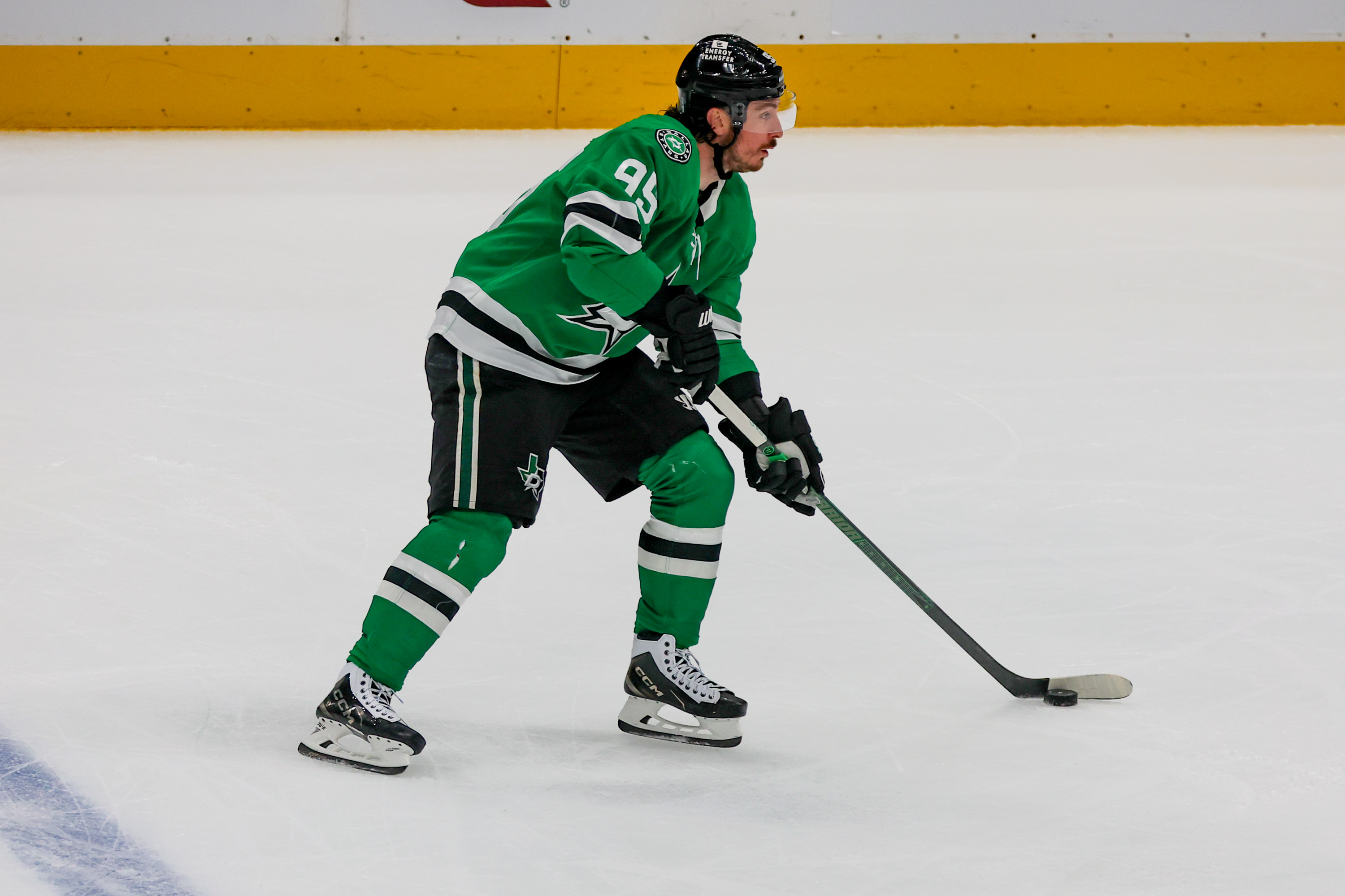 DALLAS, TX - APR 28: Dallas Stars center Matt Duchene (95) moves the puck during the Round 1 Game 5 of the 2025 Stanley Cup Playoffs game between the Dallas Stars and the Colorado Avalanche on April 28, 2025 at the American Airlines Center in Dallas, TX. (Photo by George Walker/DFWsportsonline)