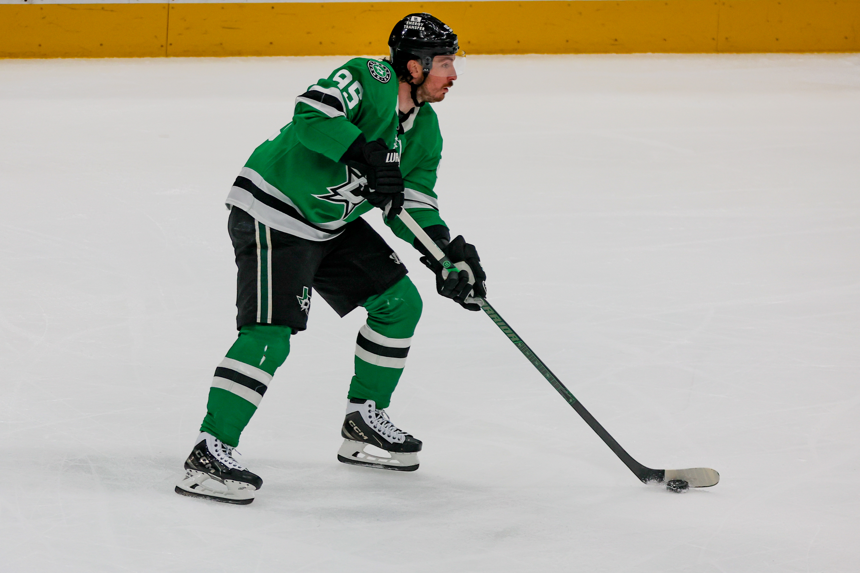 DALLAS, TX - APR 28: Dallas Stars center Matt Duchene (95) moves the puck during the Round 1 Game 5 of the 2025 Stanley Cup Playoffs game between the Dallas Stars and the Colorado Avalanche on April 28, 2025 at the American Airlines Center in Dallas, TX. (Photo by George Walker/DFWsportsonline)