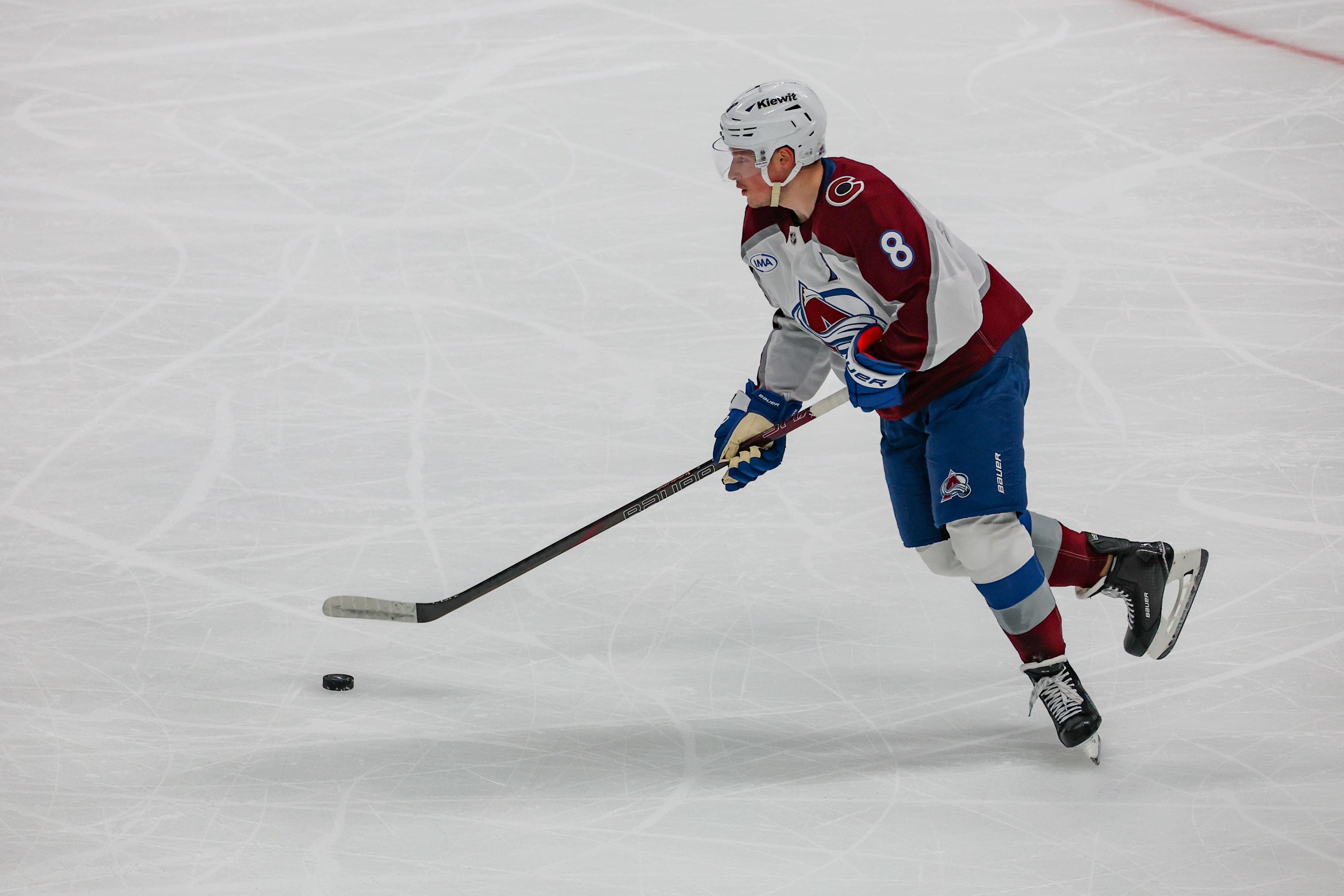 DALLAS, TX - APR 28: Colorado Avalanche defenseman Cale Makar (8) moves the puck during the Round 1 Game 5 of the 2025 Stanley Cup Playoffs game between the Dallas Stars and the Colorado Avalanche on April 28, 2025 at the American Airlines Center in Dallas, TX. (Photo by George Walker/DFWsportsonline)