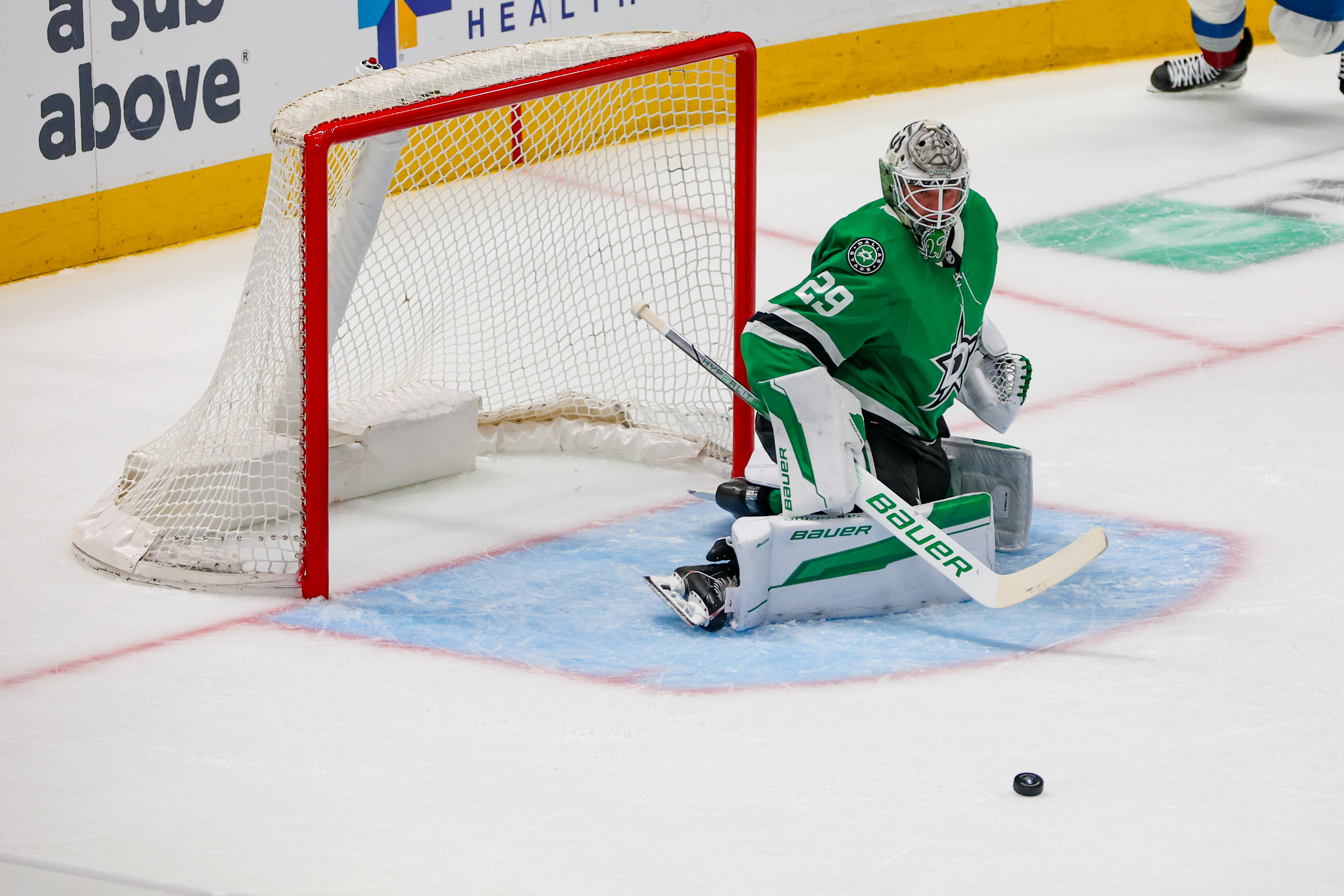 DALLAS, TX - APR 28: Dallas Stars goaltender Jake Oettinger (29) blocks a shot during the Round 1 Game 5 of the 2025 Stanley Cup Playoffs game between the Dallas Stars and the Colorado Avalanche on April 28, 2025 at the American Airlines Center in Dallas, TX. (Photo by George Walker/DFWsportsonline)