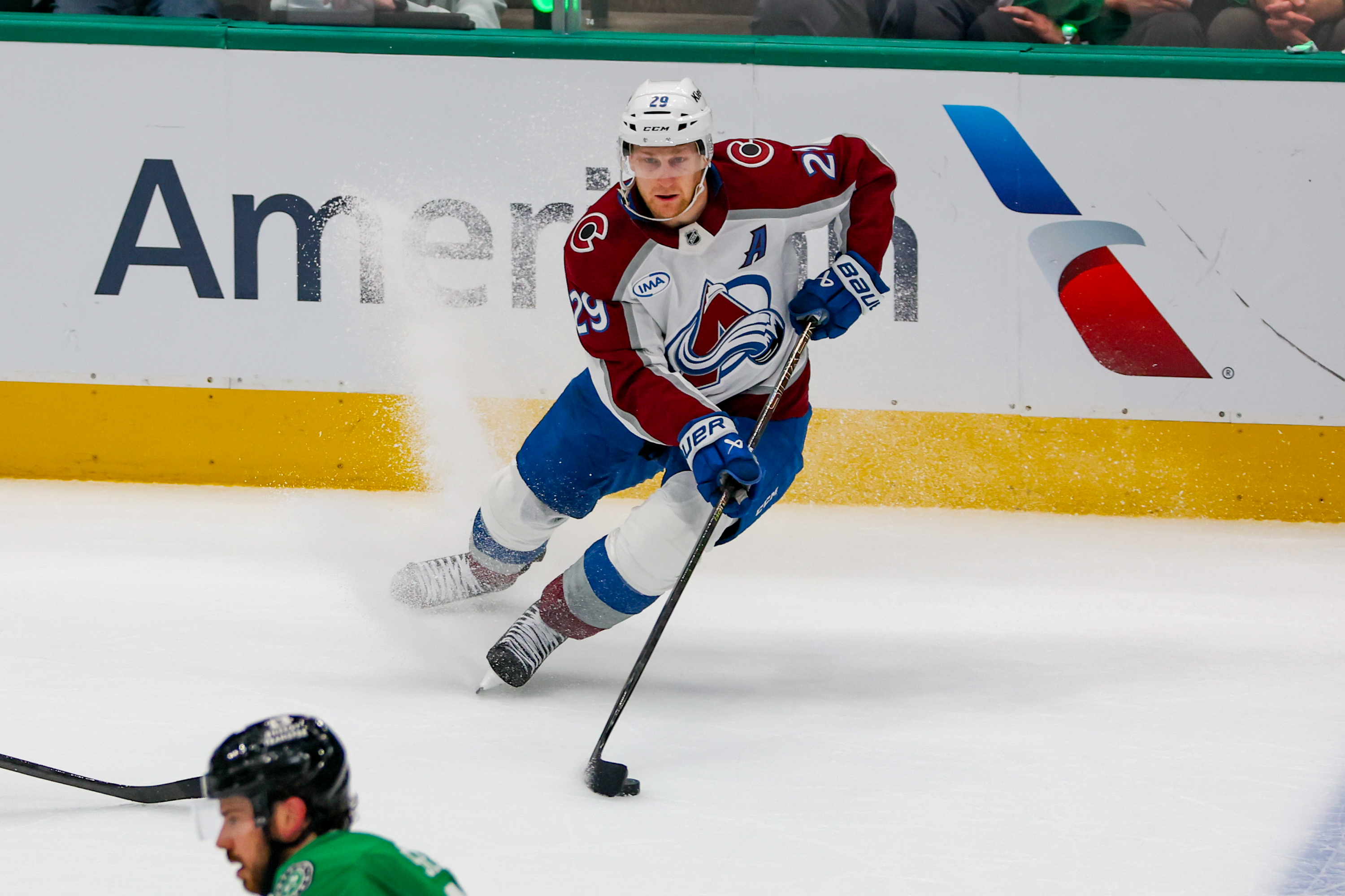 DALLAS, TX - APR 28: Colorado Avalanche center Nathan MacKinnon (29) during the Round 1 Game 5 of the 2025 Stanley Cup Playoffs game between the Dallas Stars and the Colorado Avalanche on April 28, 2025 at the American Airlines Center in Dallas, TX. (Photo by George Walker/DFWsportsonline)