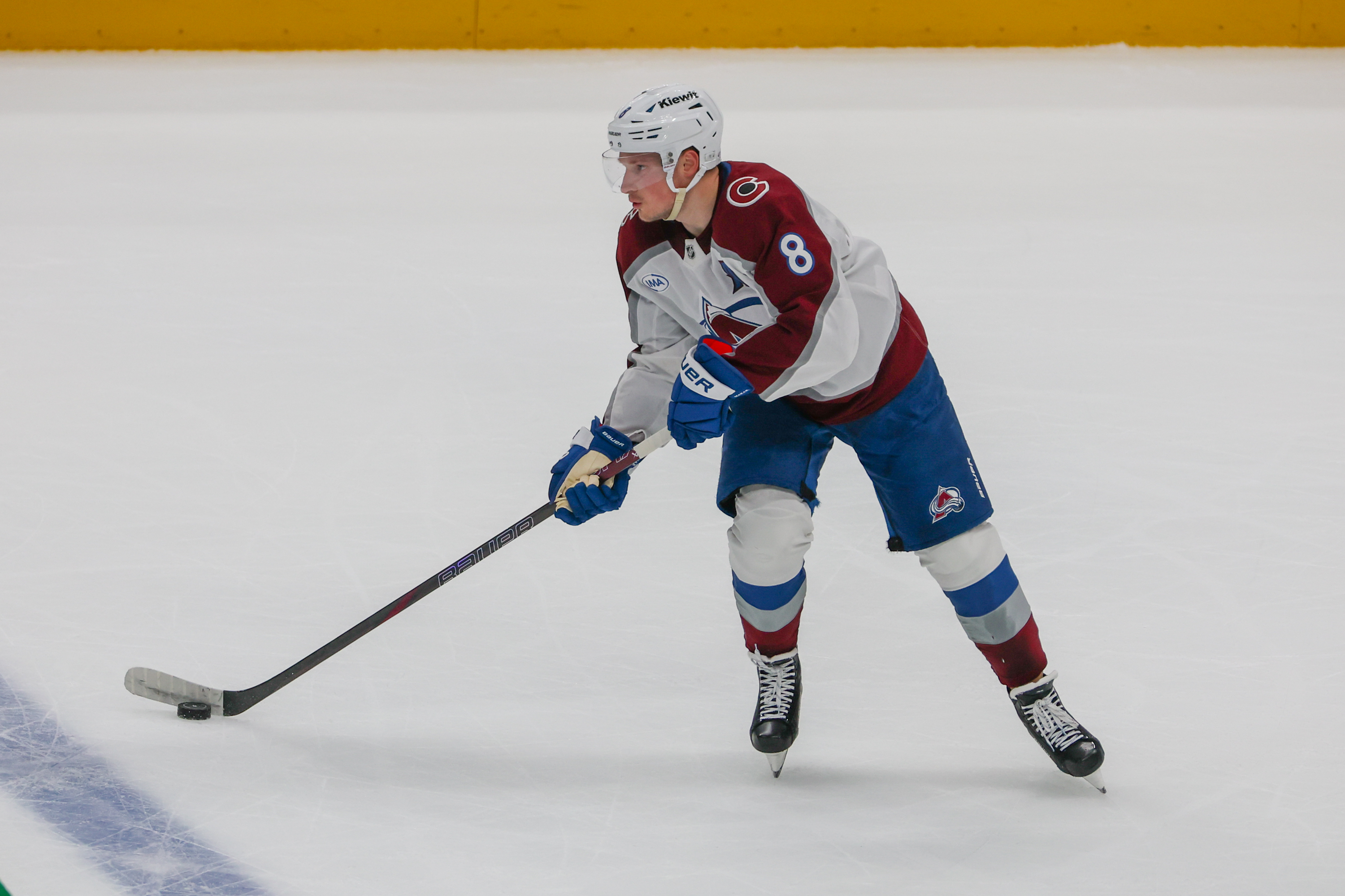 DALLAS, TX - APR 28: Colorado Avalanche defenseman Cale Makar (8) during the Round 1 Game 5 of the 2025 Stanley Cup Playoffs game between the Dallas Stars and the Colorado Avalanche on April 28, 2025 at the American Airlines Center in Dallas, TX. (Photo by George Walker/DFWsportsonline)