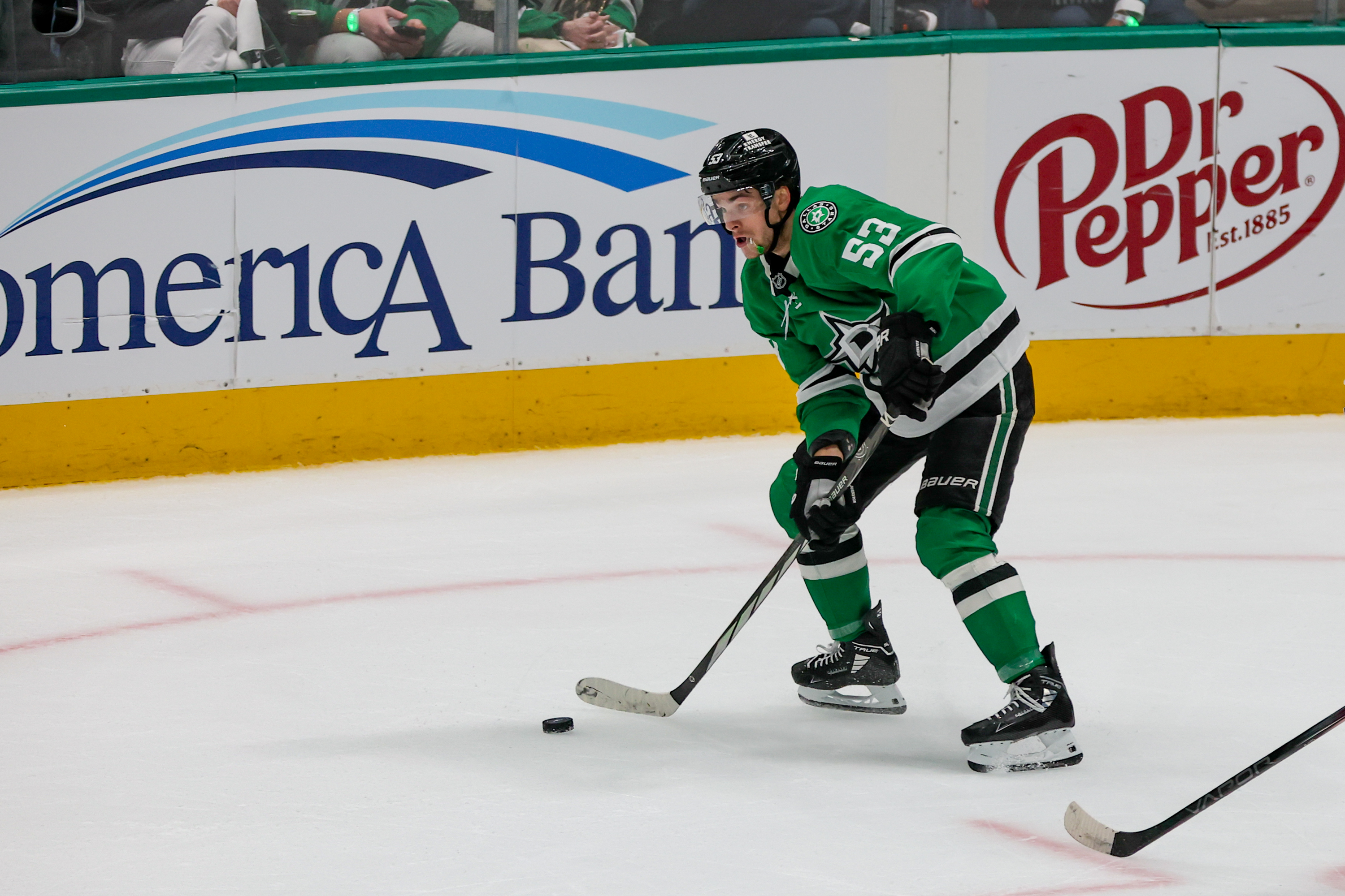 Dallas doubled its lead late in the first period when Thomas Harley’s shot rebounded off Blackwood, popped into the air, and landed on the goaltender’s back before rolling across the goal line at 19:15.