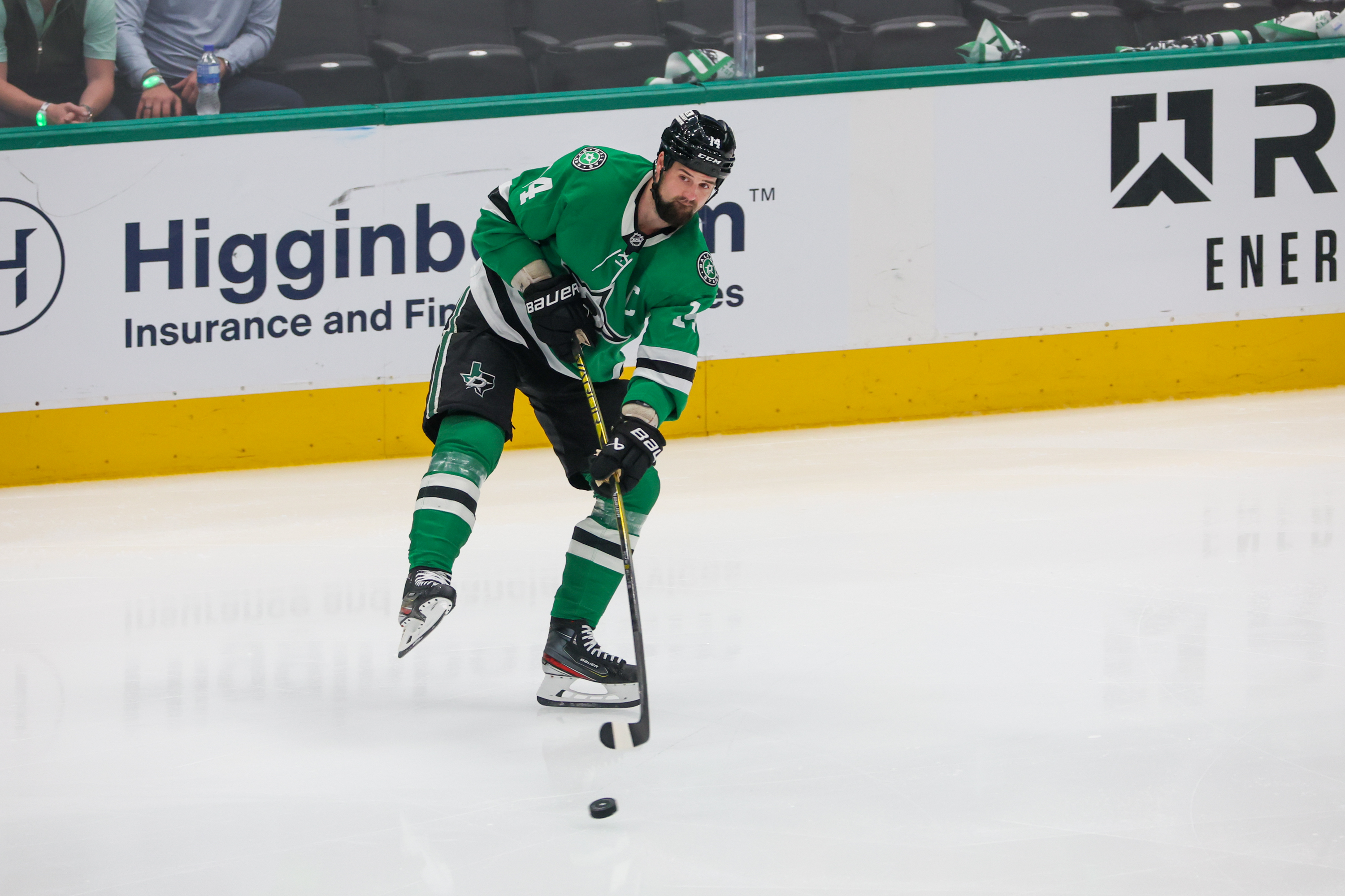 DALLAS, TX - APR 28: Dallas Stars left wing Jamie Benn (14) passes the puck during the Round 1 Game 5 of the 2025 Stanley Cup Playoffs game between the Dallas Stars and the Colorado Avalanche on April 28, 2025 at the American Airlines Center in Dallas, TX. (Photo by George Walker/DFWsportsonline)