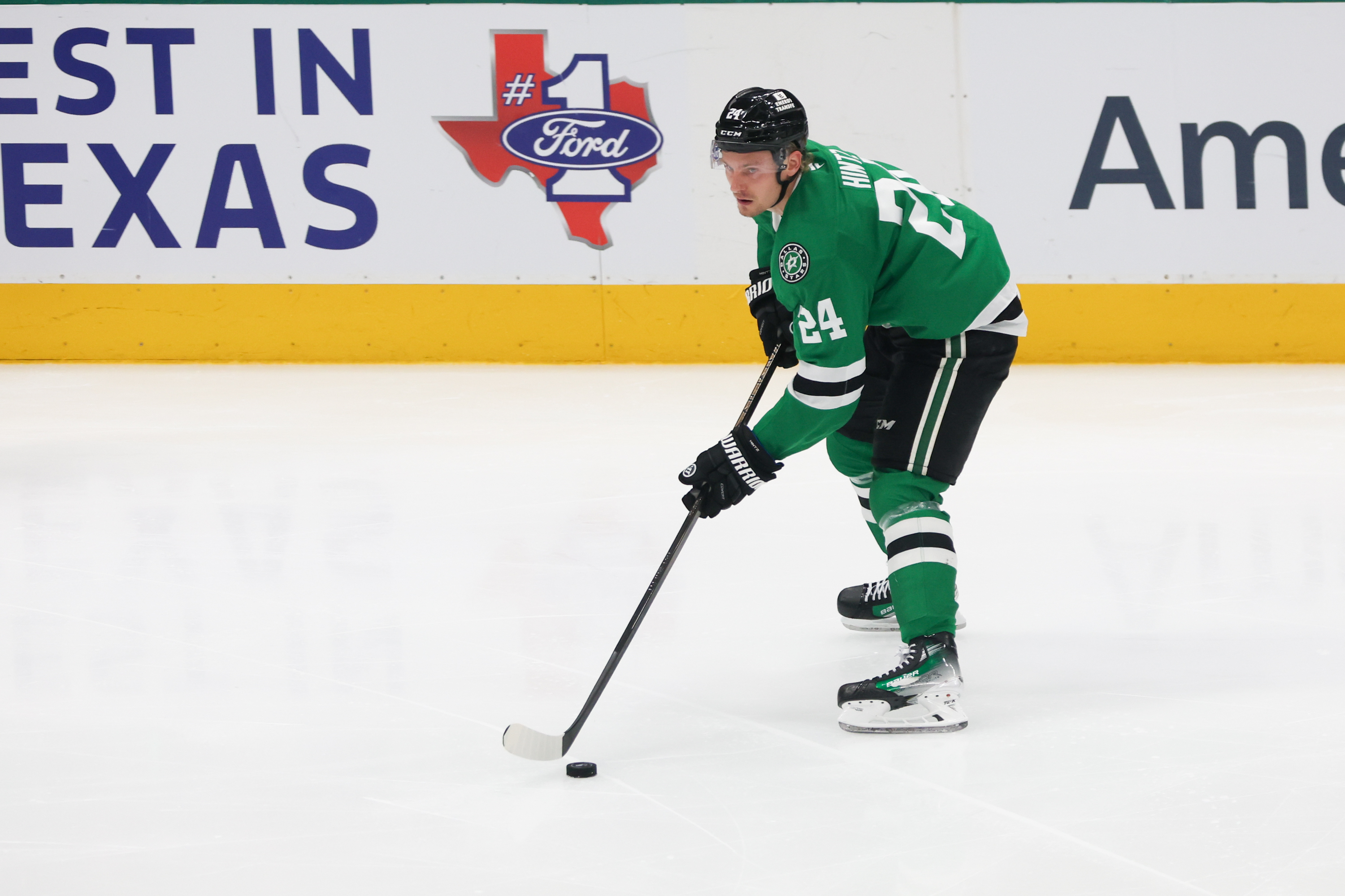 Dallas doubled its lead late in the first period when Thomas Harley’s shot rebounded off Blackwood, popped into the air, and landed on the goaltender’s back before rolling across the goal line at 19:15.