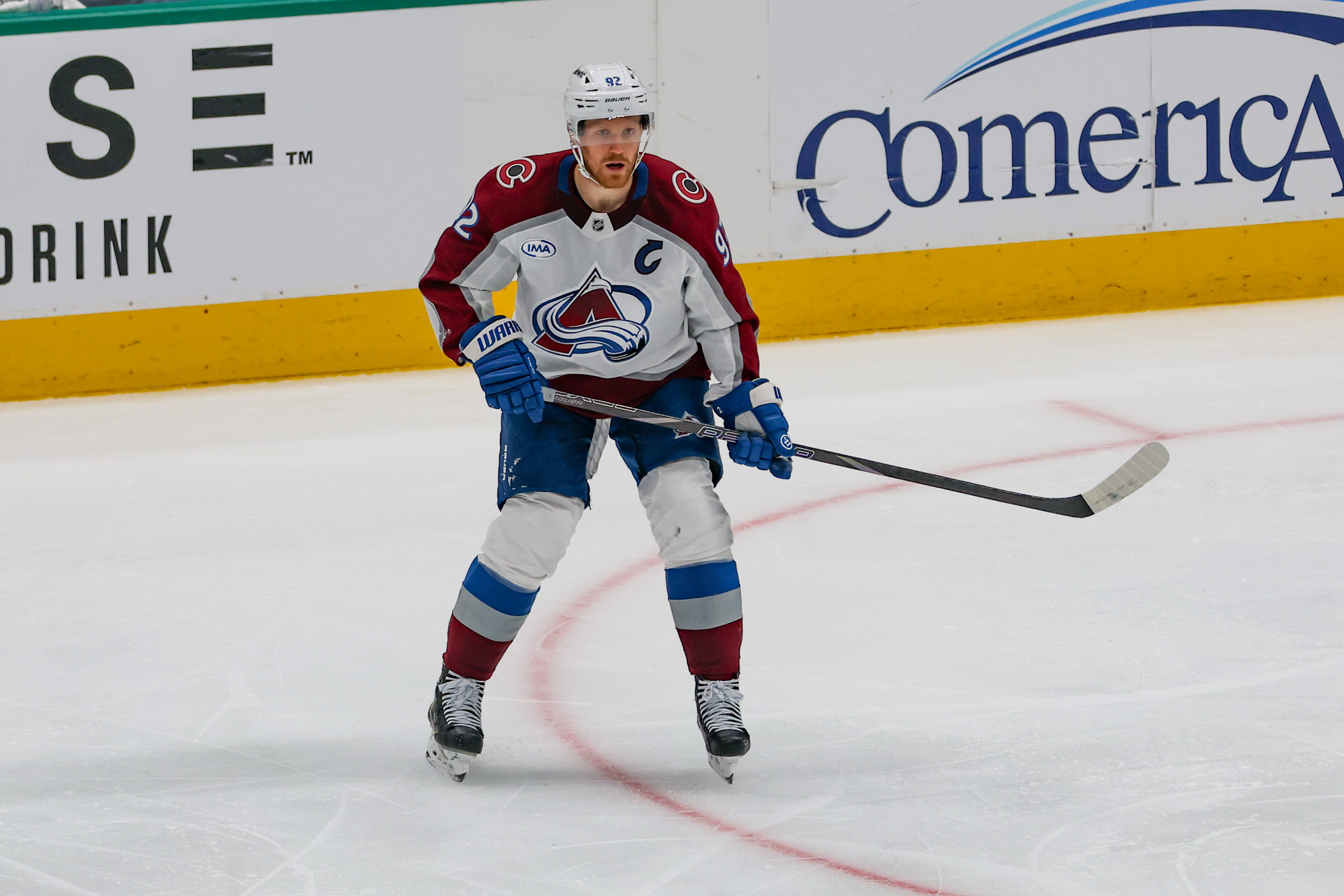 DALLAS, TX - APR 28: Colorado Avalanche left wing Gabriel Landeskog (92) during the Round 1 Game 5 of the 2025 Stanley Cup Playoffs game between the Dallas Stars and the Colorado Avalanche on April 28, 2025 at the American Airlines Center in Dallas, TX. (Photo by George Walker/DFWsportsonline)