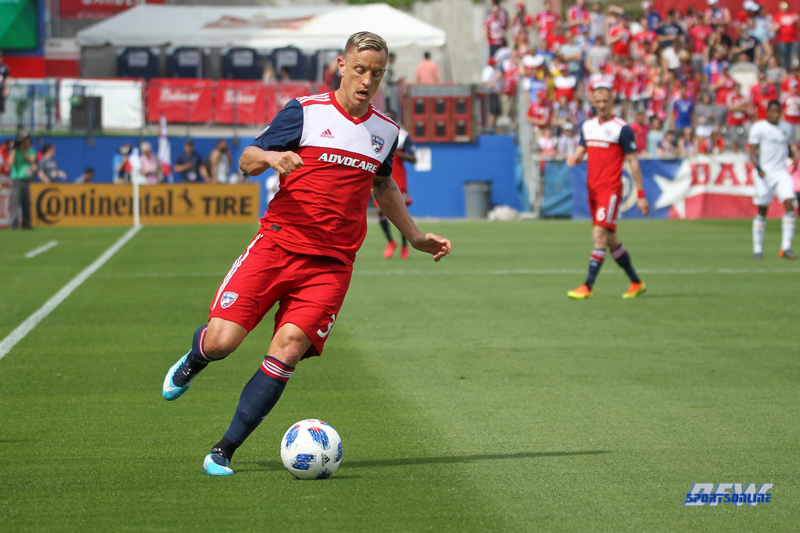 MAR 24, 2018: FC Dallas defender Reto Ziegler (3) kicks the ball during the MLS game between FC Dallas and Portland Timber on March 24, 2018, at Toyota Stadium in Frisco, TX. (Photo by George Walker/DFWsportsonline)