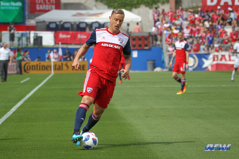 MAR 24, 2018: FC Dallas defender Reto Ziegler (3) kicks the ball during the MLS game between FC Dallas and Portland Timber on March 24, 2018, at Toyota Stadium in Frisco, TX. (Photo by George Walker/DFWsportsonline)