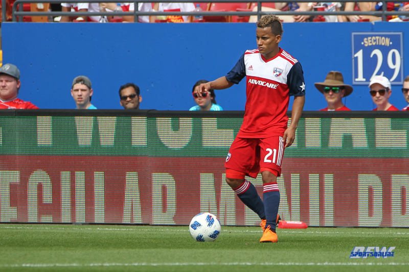 MAR 24, 2018: FC Dallas midfielder Michael Barrios (21) moves the ball during the MLS game between FC Dallas and Portland Timber on March 24, 2018, at Toyota Stadium in Frisco, TX. (Photo by George Walker/DFWsportsonline)