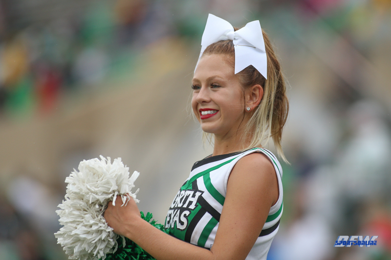DENTON, TX - SEPTEMBER 08: North Texas Mean Green cheerleader performs during the game between North Texas and Incarnate Word on September 8, 2018 at Apogee Stadium in Denton, TX. (Photo by George Walker/DFWsportsonline)