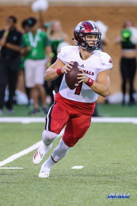 DENTON, TX - SEPTEMBER 08: Incarnate Word Cardinals quarterback Jon Copeland (1) passes during the game between North Texas and Incarnate Word on September 8, 2018 at Apogee Stadium in Denton, TX. (Photo by George Walker/DFWsportsonline)