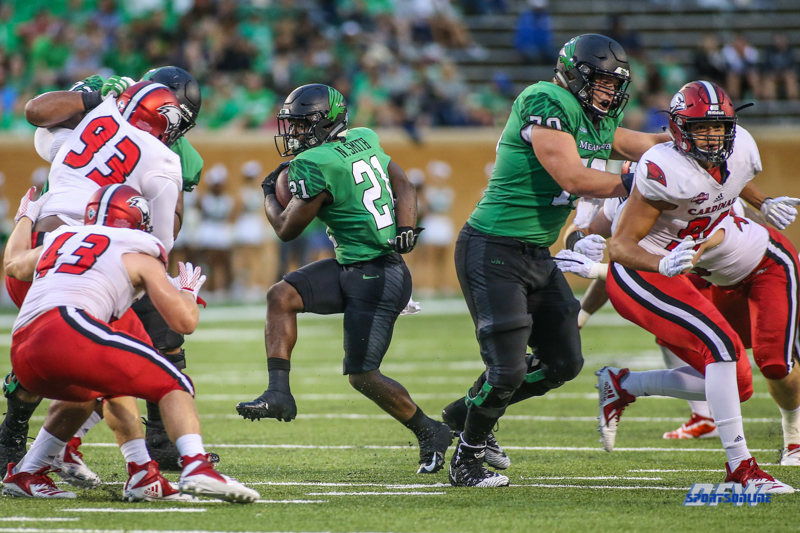DENTON, TX - SEPTEMBER 08: North Texas Mean Green running back Nic Smith (21) runs into the line during the game between North Texas and Incarnate Word on September 8, 2018 at Apogee Stadium in Denton, TX. (Photo by George Walker/DFWsportsonline)