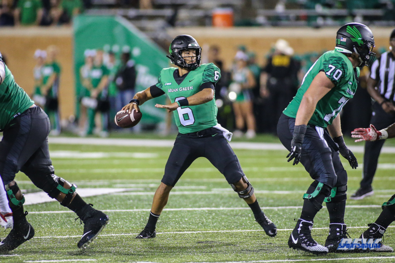 DENTON, TX - SEPTEMBER 08: North Texas Mean Green quarterback Mason Fine (6) passes during the game between North Texas and Incarnate Word on September 8, 2018 at Apogee Stadium in Denton, TX. (Photo by George Walker/DFWsportsonline)