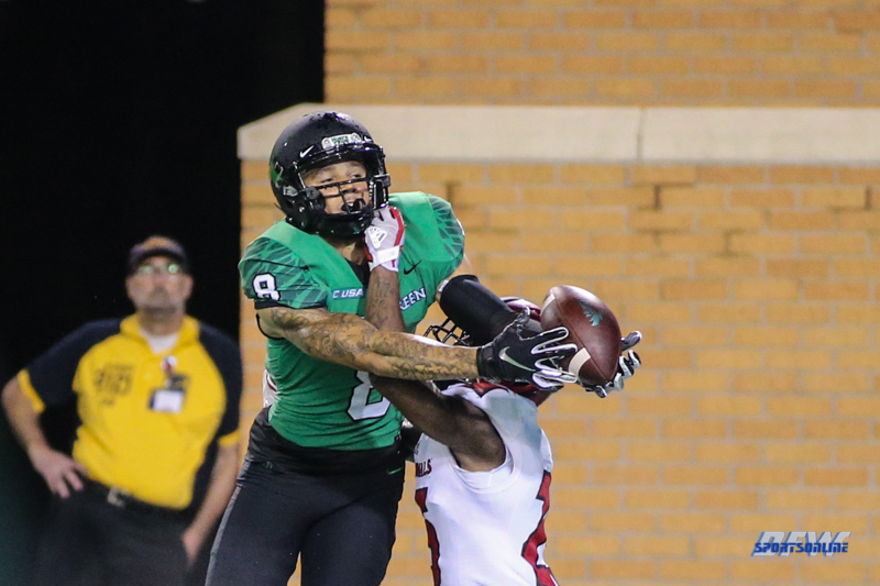DENTON, TX - SEPTEMBER 08: North Texas Mean Green wide receiver Rico Bussey Jr. (8) fights for the ball during the game between North Texas and Incarnate Word on September 8, 2018 at Apogee Stadium in Denton, TX. (Photo by George Walker/DFWsportsonline)