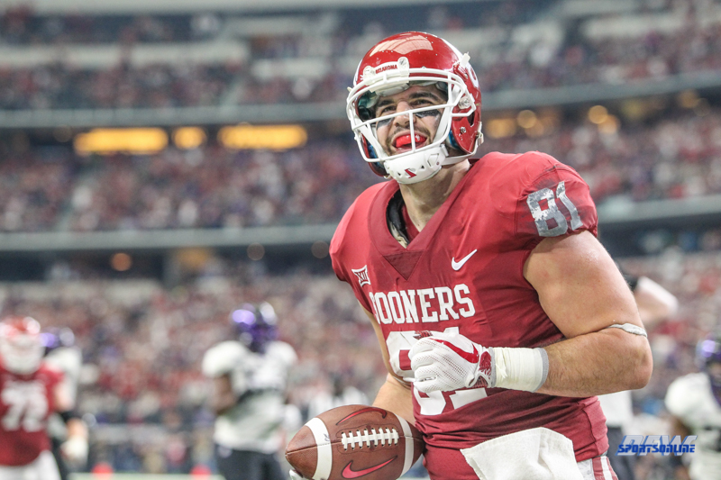 ARLINGTON, TX - DECEMBER 02: Oklahoma Sooners tight end Mark Andrews (81) makes a catch in the end zone for a touchdown during the Big 12 Championship game on December 2, 2017 at AT&T Stadium in Arlington, TX. (Photo by George Walker/Icon Sportswire)