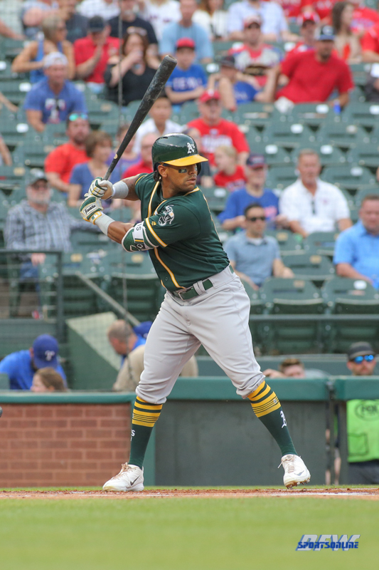 ARLINGTON, TX - APRIL 24: Oakland Athletics designated hitter Khris Davis (2) stands in the batters box during the game between the Texas Rangers and the Oakland Athletics on April 24, 2018 at Globe Life Park in Arlington, TX. (Photo by George Walker/Icon Sportswire)