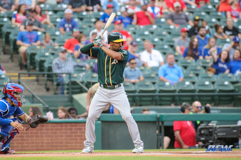 ARLINGTON, TX - APRIL 24: Oakland Athletics shortstop Marcus Semien (10) stands at the plate during the game between the Texas Rangers and the Oakland Athletics on April 24, 2018 at Globe Life Park in Arlington, TX. (Photo by George Walker/Icon Sportswire)