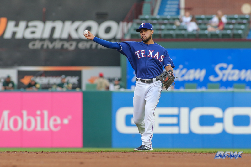 ARLINGTON, TX - APRIL 24: Texas Rangers infielder Isiah Kiner-Falefa (9) throws to first base during the game between the Texas Rangers and the Oakland Athletics on April 24, 2018 at Globe Life Park in Arlington, TX. (Photo by George Walker/Icon Sportswire)