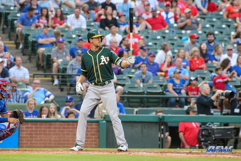 ARLINGTON, TX - APRIL 24: Oakland Athletics outfielder Stephen Piscotty (25) stands at the plate during the game between the Texas Rangers and the Oakland Athletics on April 24, 2018 at Globe Life Park in Arlington, TX. (Photo by George Walker/Icon Sportswire)