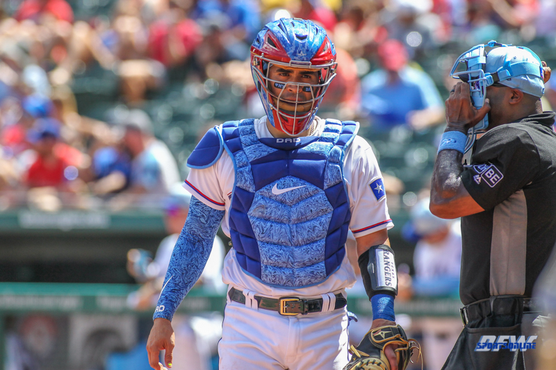 ARLINGTON, TX - JUN 17: Texas Rangers catcher Robinson Chirinos (61) during the game between the Colorado Rockies and Texas Rangers on June 17, 2018, at Globe Life Park in Arlington, TX. (Photo by George Walker/DFWsportsonline)
