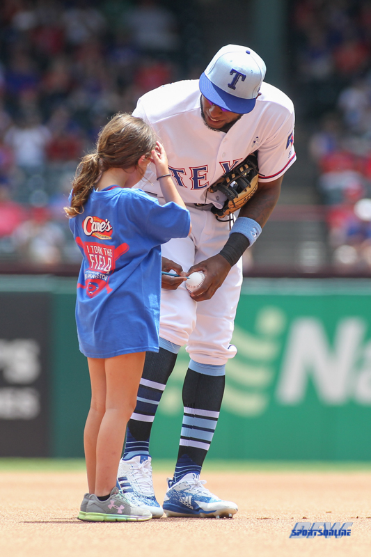ARLINGTON, TX - JUNE 17: Texas Rangers Infielder Jurickson Profar (19) signs a ball for a fan during the game between the Colorado Rockies and the Texas Rangers on June 17, 2018 at Globe Life Park in Arlington, TX. (Photo by George Walker/Icon Sportswire)