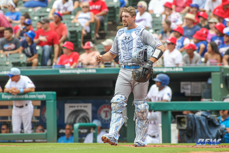 ARLINGTON, TX - JUNE 17: Colorado Rockies catcher Tom Murphy (23) looks over the field during the game between the Colorado Rockies and the Texas Rangers on June 17, 2018 at Globe Life Park in Arlington, TX. (Photo by George Walker/Icon Sportswire)