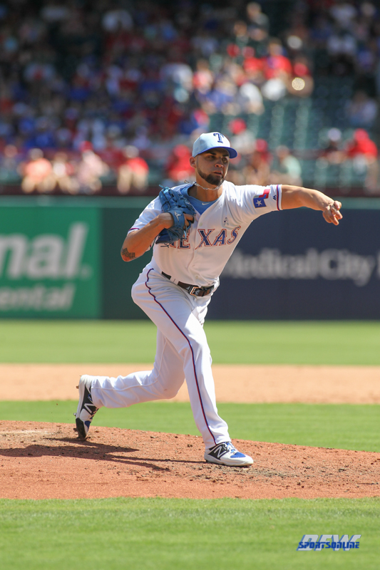 ARLINGTON, TX - JUNE 17: Texas Rangers pitcher Alex Claudio (58) throws to the plate during the game between the Colorado Rockies and the Texas Rangers on June 17, 2018 at Globe Life Park in Arlington, TX. (Photo by George Walker/Icon Sportswire)