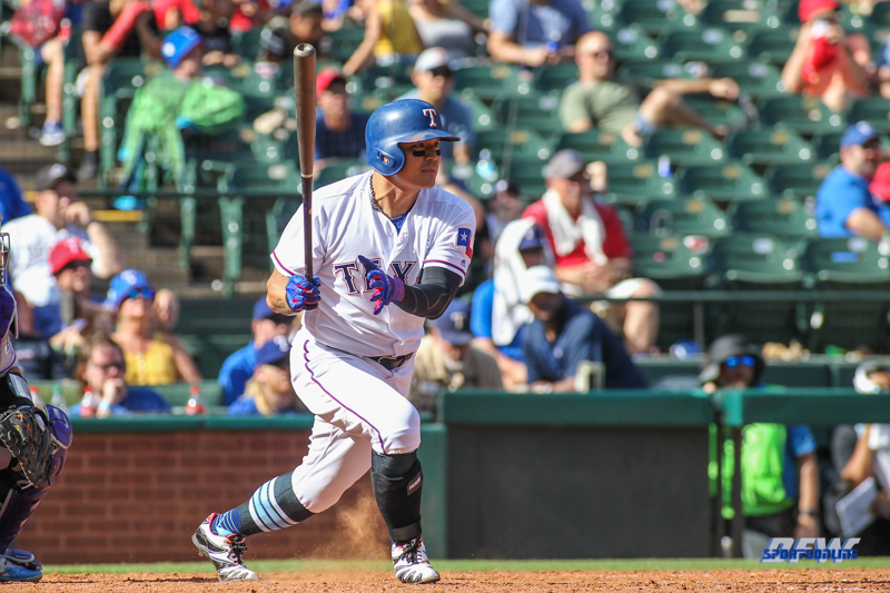 ARLINGTON, TX - JUNE 17: Texas Rangers designated hitter Shin-Soo Choo (17) runs out of the batter's box during the game between the Colorado Rockies and the Texas Rangers on June 17, 2018 at Globe Life Park in Arlington, TX. (Photo by George Walker/Icon Sportswire)