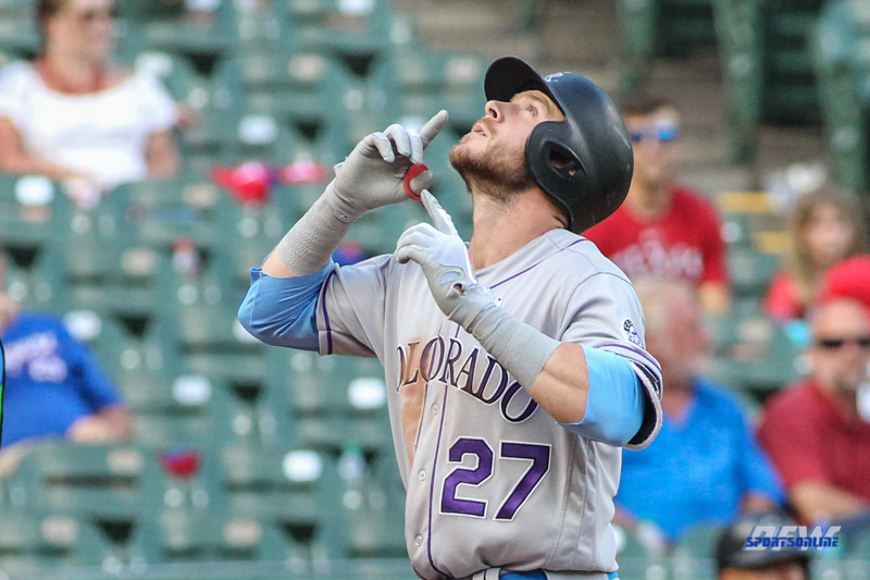 ARLINGTON, TX - JUNE 17: Colorado Rockies shortstop Trevor Story (27) points to the sky as he rounds the bases after hitting a home run during the game between the Colorado Rockies and the Texas Rangers on June 17, 2018 at Globe Life Park in Arlington, TX. (Photo by George Walker/Icon Sportswire)