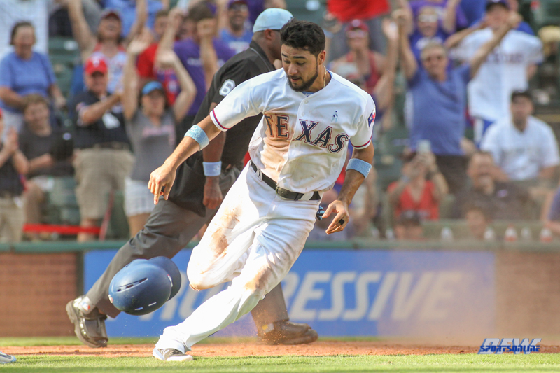 ARLINGTON, TX - JUNE 17: Texas Rangers infielder Isiah Kiner-Falefa (9) crosses home plate for the winning run during the game between the Colorado Rockies and the Texas Rangers on June 17, 2018 at Globe Life Park in Arlington, TX. (Photo by George Walker/Icon Sportswire)