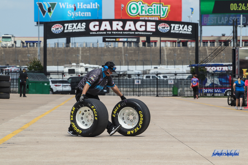 FORT WORTH, TX - JUNE 07: NASCAR Camping World Truck Series crew member pushes tires during practice for the 2018 PPG 400 on June 7, 2018 at Texas Motor Speedway in Fort Worth, TX. (Photo by George Walker/DFWsportsonline)